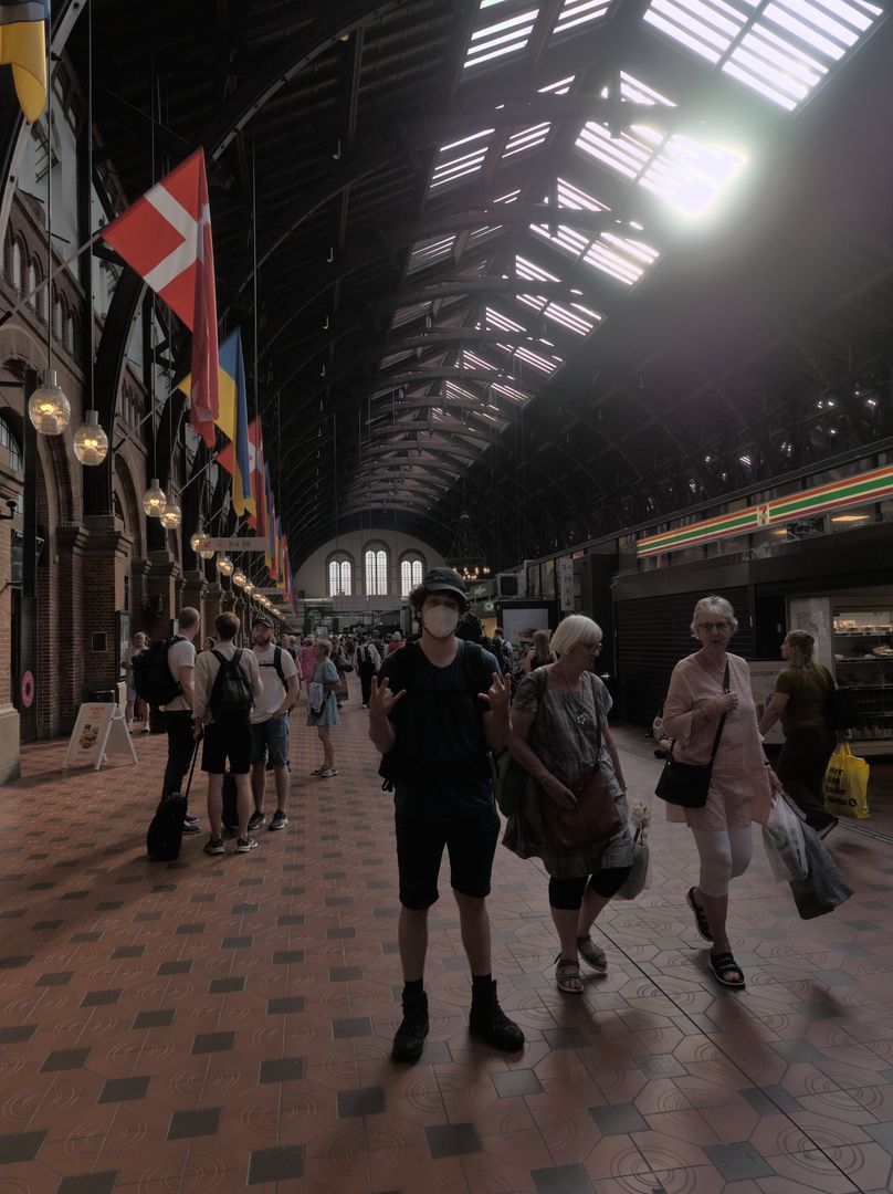Weil wir zum Glück heute keinen Anschlusszug mehr erwischen müssen, sondern nur irgendwie noch nach Hamburg möchten, gehen wir zum Ticketschalter und erfragen dort, wie wir nach Kopenhagen kommen, und bekommen dort einen Zettel mit den entsprechenden Verbindungen in die Hand gedrückt. Nachdem uns noch eine Stunde in Hamburg bleibt jausnen wir ein bisschen etwas und machen uns dann mit reichlich Puffer auf den Weg zum Bahnsteig. Dort stellen wir zu unserem großen Ärger fest, dass der Zug nicht beim Hamburger Hauptbahnhof sondern in Hamburg-Altona abfährt. Also flitzen wir so schnell uns unsere Füße tragen zur S-Bahn und fahren nach Hamburg-Altona. In der S-Bahn fällt uns etwas auf, was auch auf die anderen deutschen Züge zutreffen wird: alle tragen Maske. Und zwar ausnahmslos. Das hat uns positiv überrascht. In Wien ist so eine Disziplin leider nur Wunschdenken.