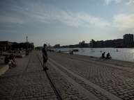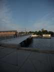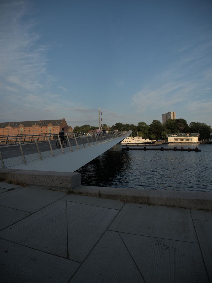 Schließlich machen wir noch einen Spaziergang in der Christianshavner Gegend. Wir gehen über eine witzig gebogene Rad- und Fußgängerbrücke und kommen auf eine nette Promenade am Wasser. Weil wir Hunger haben suchen wir uns eine Pizzeria in der Nähe, nehmen zwei Pizzen mit und setzen und damit bei der Promenade hin. Danach gehen wir wieder in Hostel zurück und legen uns in unserem viel zu schwülen Zimmer zu Bett. In unserem 6-Bett Zimmer liegt abgesehen von uns zum Glück nur eine andere Person. Um die Hitze zu bekämpfen steht ein Ventilator im Zimmer der auf voller Kraft die ganze Nacht durchläuft.