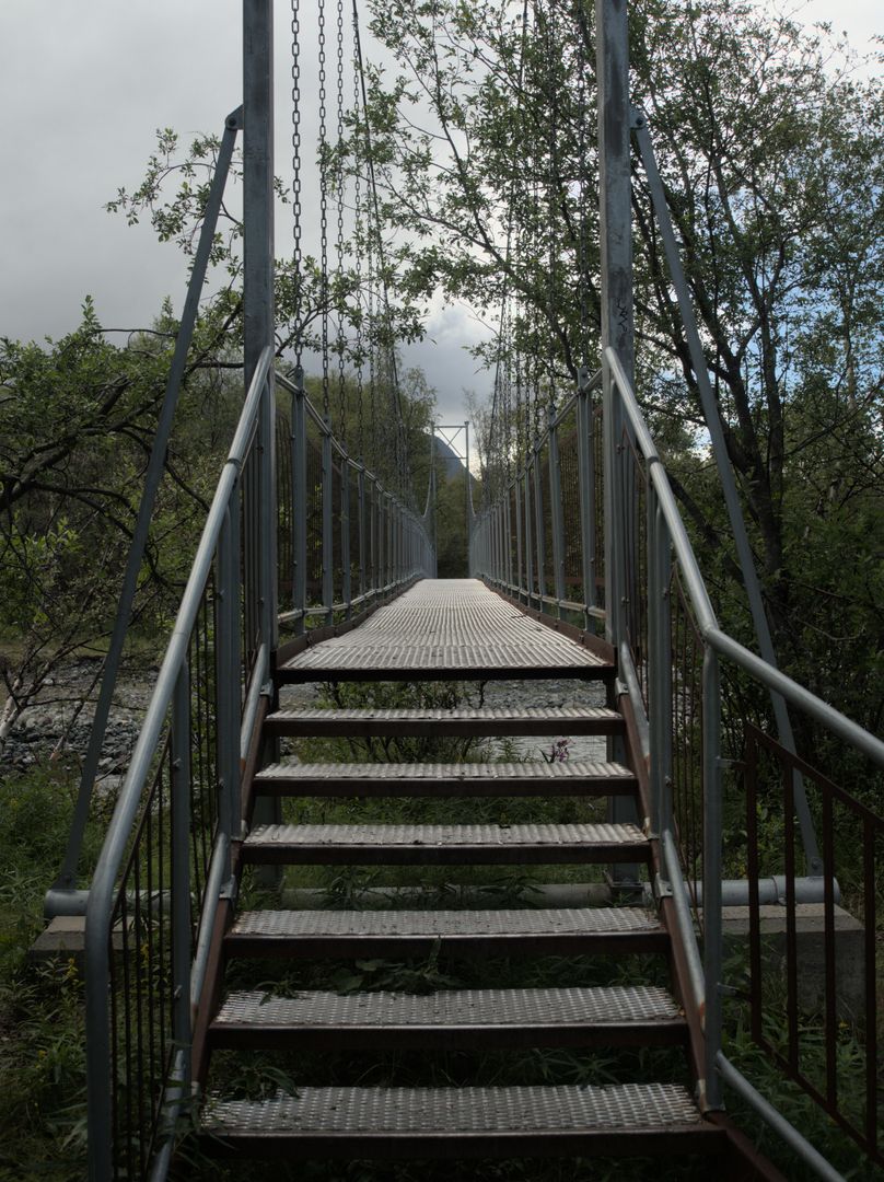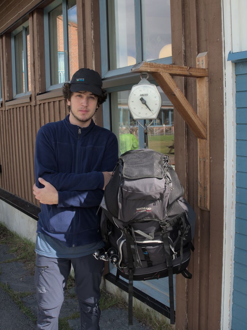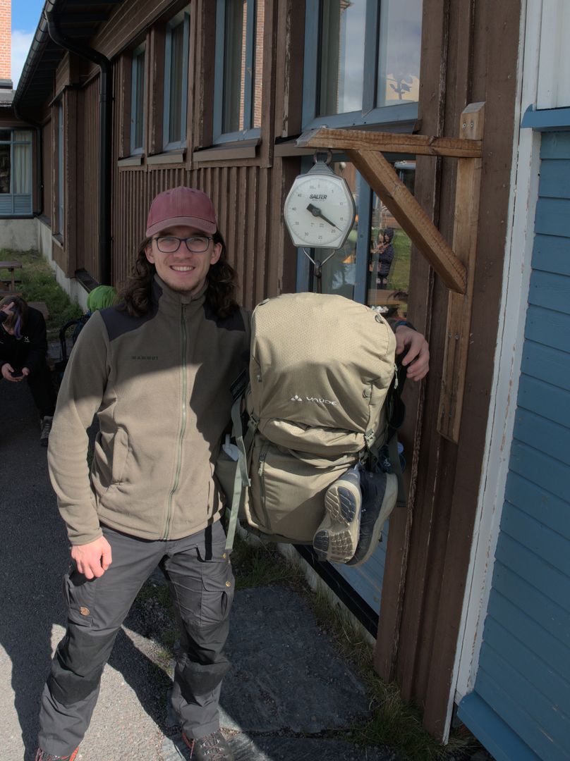 Nachdem wir uns an den Wasserströmen sattgesehen haben gehen wir weiter zur Fjällstation. Dort decken wir uns mit Lebensmitteln ohne Ende ein. Weil wir zusätzlich noch Spiritus, ein Paar Handschuhe und Aufnäher und andere Kleinigkeiten kaufen, zahlen wir rund 1500 schwedische Kronen, also etwa 150€. Mit verstauten Einkäufen aufgefüllten Wasserflaschen wagen wir uns an die Kofferwaage die vor der Fjällstation angebracht ist. Mein Rucksack wiegt knappe 19 Kilogramm, Leons ganze 21 Kilos. Nach einer geschwinden Jause gehts nun wirklich auf den Kungsleden.