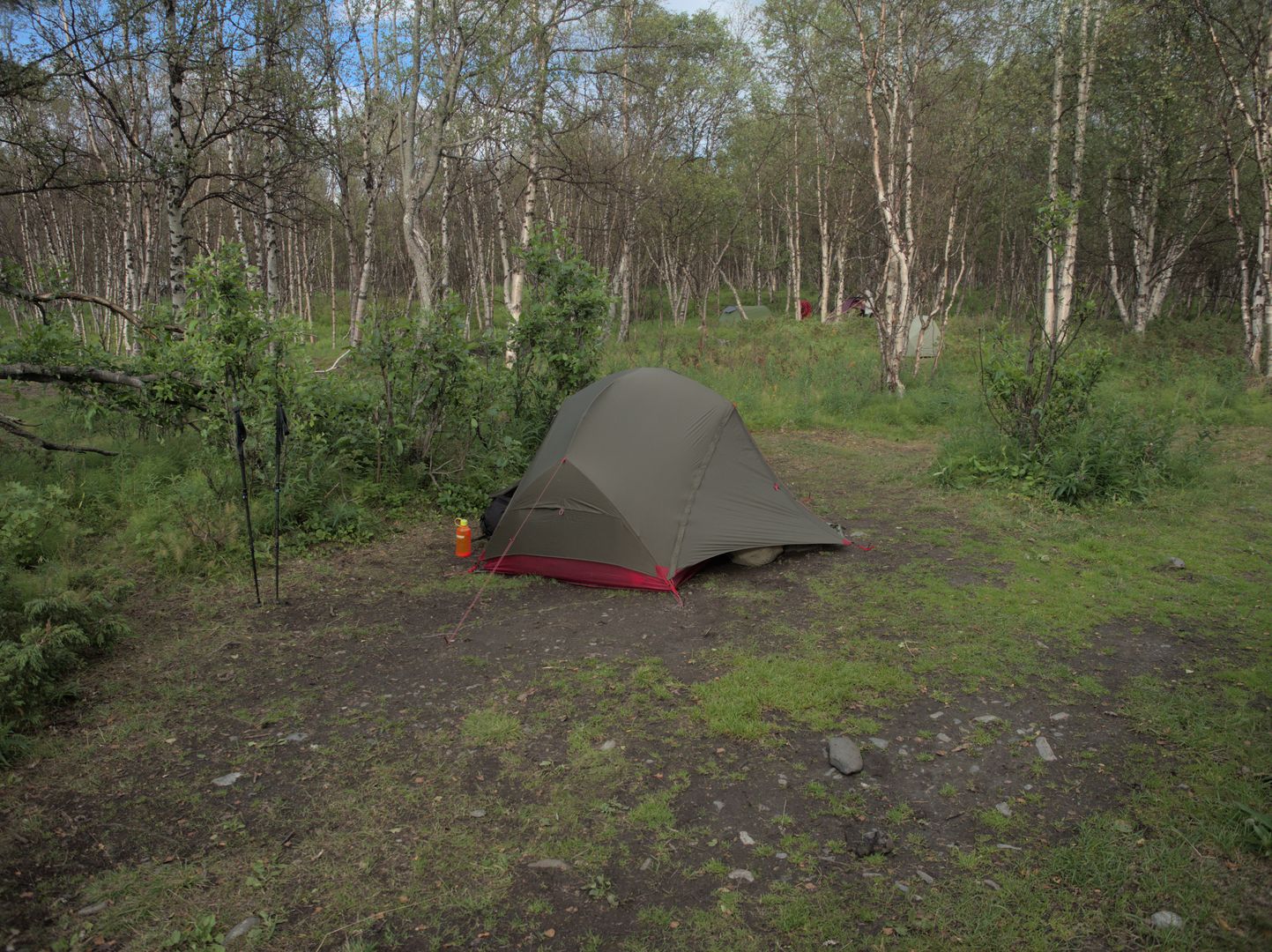 Weil wir uns noch im Abisko Nationalpark befinden, dürfen wir unser Zelt nicht irgendwo, sondern nur an bestimmten Stellen aufstellen. Entlang des Kungsleden gibt es aber nur 2 solcher Stellen, und wir wollen es am ersten Tag lieber gemütlich angehen, weshalb wir schon nach 2 Stunden an unserem Zeltplatz an der Mündung des Nissonjohka in den Abiskojåkka ankommen und um 15:00 unser Zelt aufbauen. Wir sind nicht die ersten an dem Zeltplatz und im Laufe des Tages wird es sich hier noch ordentlich füllen. Am Abend stehen hier über 20 Zelte.