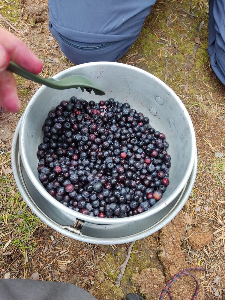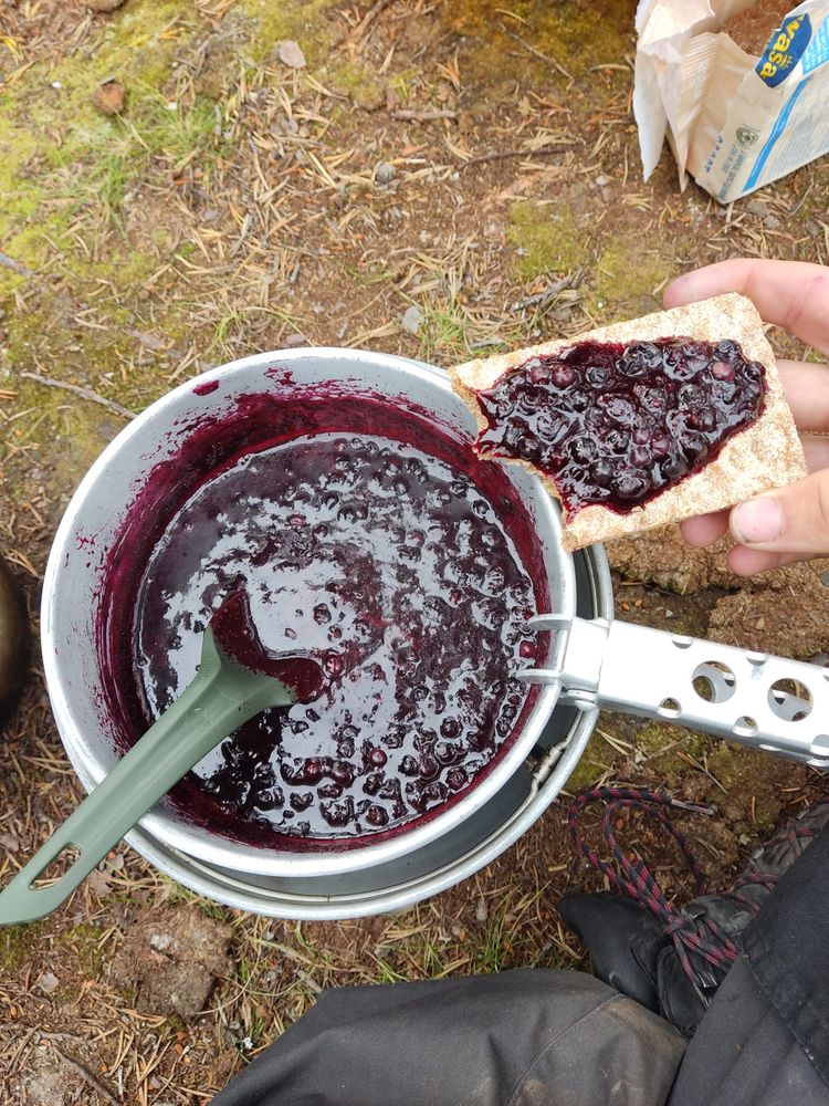 Auch heute finden wir wieder viele reife Moltebeeren. Ich weiß nicht, ob wir jetzt so viele finden, weil wir weiter im Süden sind, oder weil es einfach etwas später im Jahr ist. Die vielen Sonnenstunden geben den Pflanzen im Sommer doch einen ziemlichen Wachstumsboost. Jedenfalls gibt es die hier und jetzt wesentlich häufiger als bisher, und sie sind wirklich etwas Gutes, das wir außerhalb des Fjälls wohl nicht mehr bekommen werden.