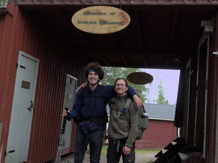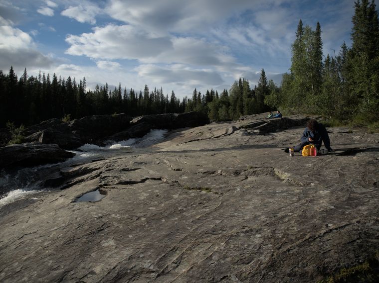 Etwas später als sonst, essen wir heute auf einem umgefallenen Baumstamm sitzend ein letztes Mal unsere Makkaroni-Tubenkäse Kreation. Dabei beginnt es leicht zu nieseln. Sonnenlicht sehen wir heute ohnehin kaum. Von unserer Essensstelle sind es noch etwa 7 Kilometer bis nach Kvikkjokk. Als wir uns auf etwa 2 Kilometer an Kvikkjokk annähern, haben wir wieder Empfang und auch den Gamájåhkå können wir aus der Ferne rauschen hören. Dieser Fluss, dessen Größe wohl nur mit der des Tjäktjajåkka und des Abiskojåkka vergleichbar ist, mündet bei Kvikkjokk in diverse Seen.