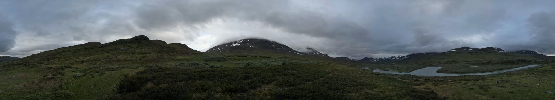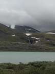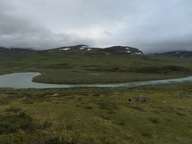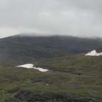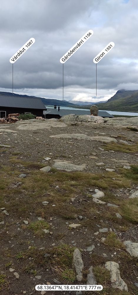 Als erstes beenden wir den Anstieg, den wir gestern Abend begonnen hatten. Die letzten 70 Höhenmeter haben es noch in sich, und wir sind froh das nicht gestern doch noch durchgeboxt zu haben. Doch als wir oben sind haben wir wieder einmal phänomenale Blicke. Wir sehen ein kleines Samendorf, und haben zwischen Gárddenvárri und Ribakbákti Ausblick auf das Gebirge nördlich des Kanajåkka. In die andere Richtung sehen wir weit in das Tal in dem der Áhppajárvi liegt hinein, und sehen sogar den Alip Vealevárri. Ein bisschen weiter im Süden gelegen ist auch der Gletscher am Kåtojåkka sichtbar.
