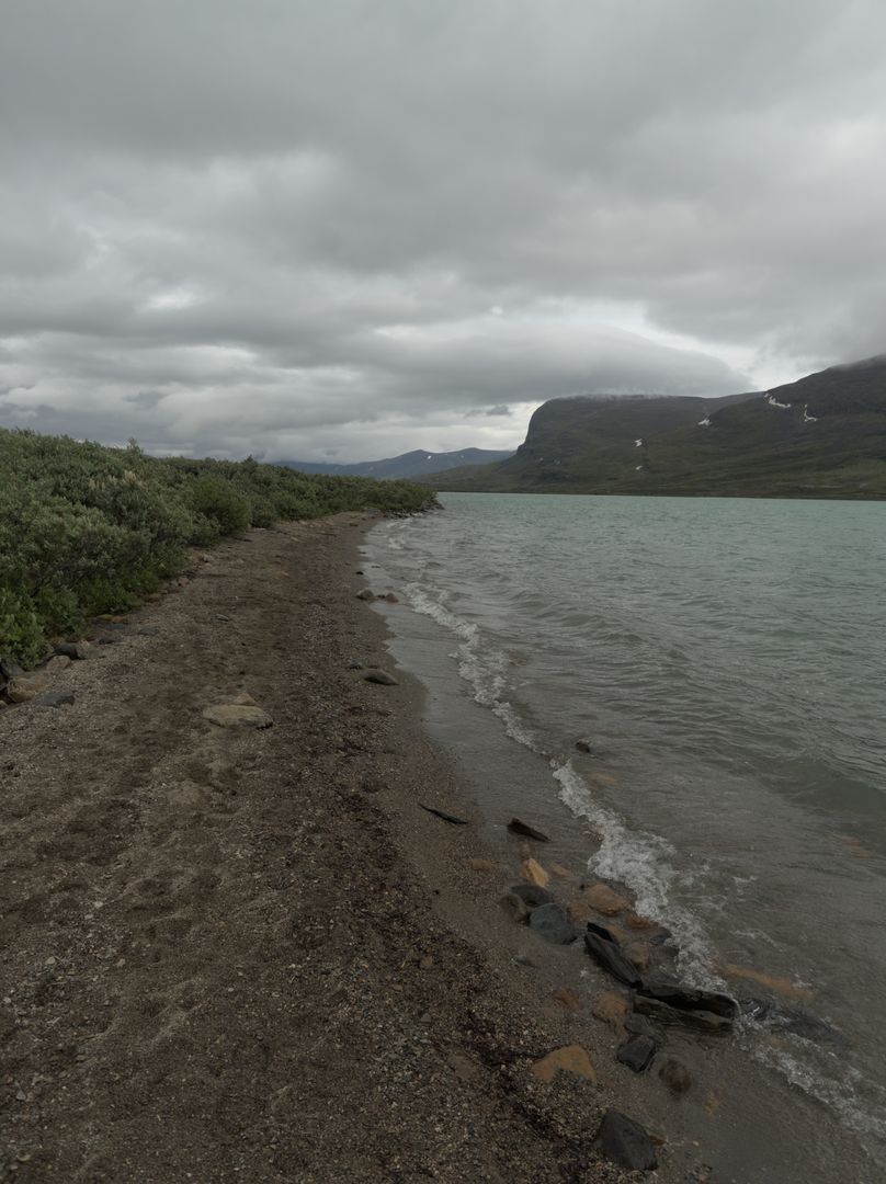 Dann kommen wir auch am Strand des Alesjaure vorbei. Wenn das Wasser nicht so