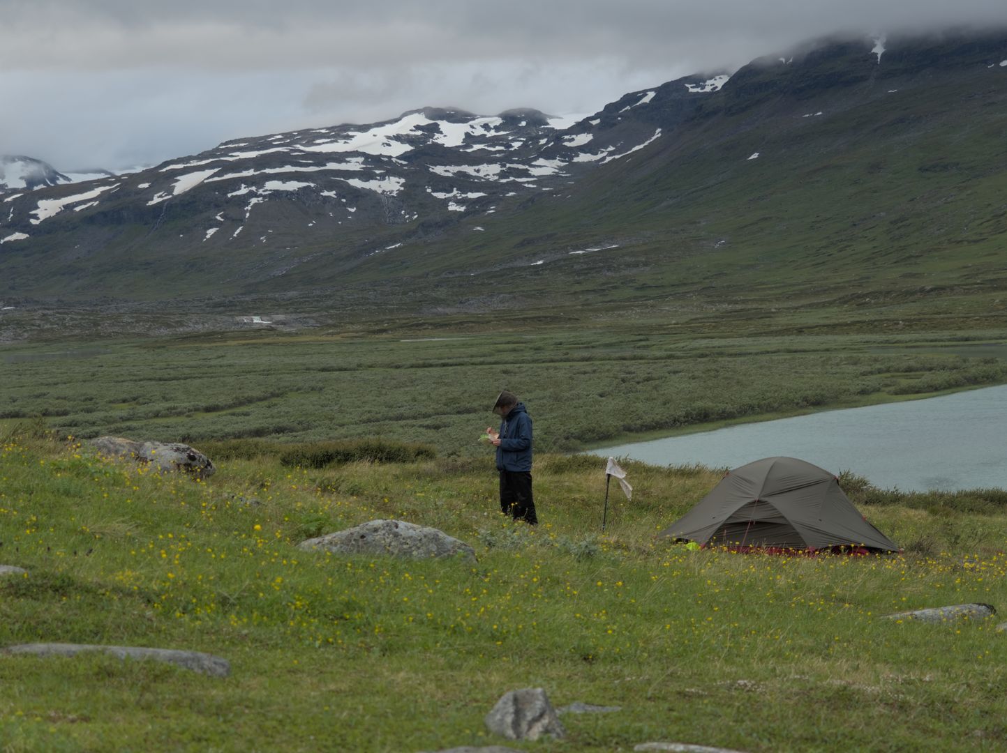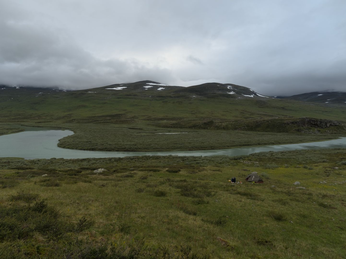 Wir gehen nach der Hüttenpause noch 1-2km den Kungsleden entlang, bis wir unser Zelt aufbauen. Als wir unseren Zeltplatz aussuchen ist es schon 19:00, und wir beeilen uns, Essen zu machen, und fallen um etwa 21:00 ins Bett.