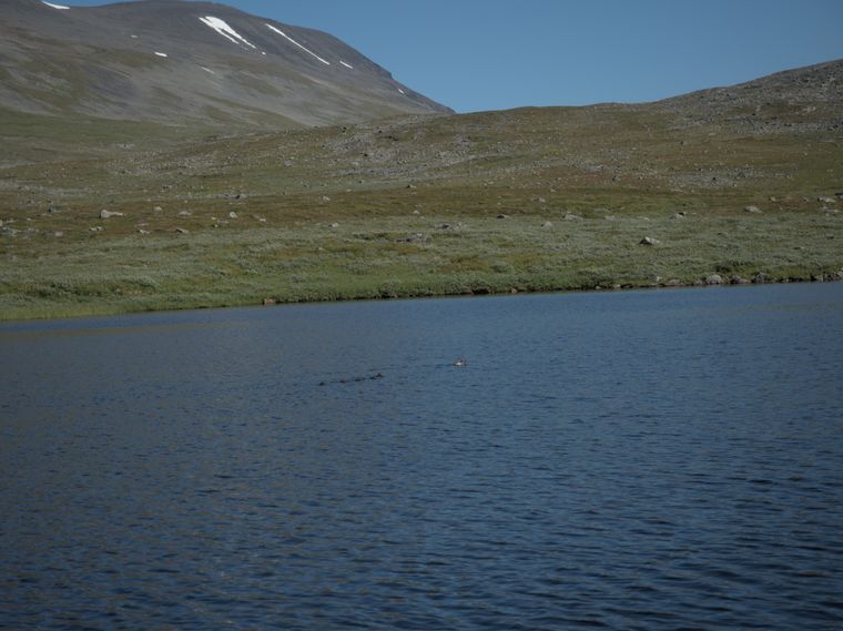 umherschwimmt, und dabei die Aussicht auf die majestätischen Sarekgipfel